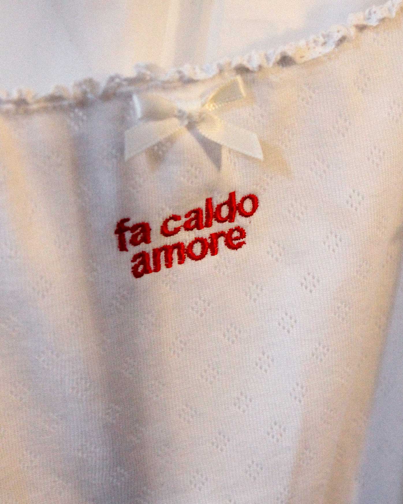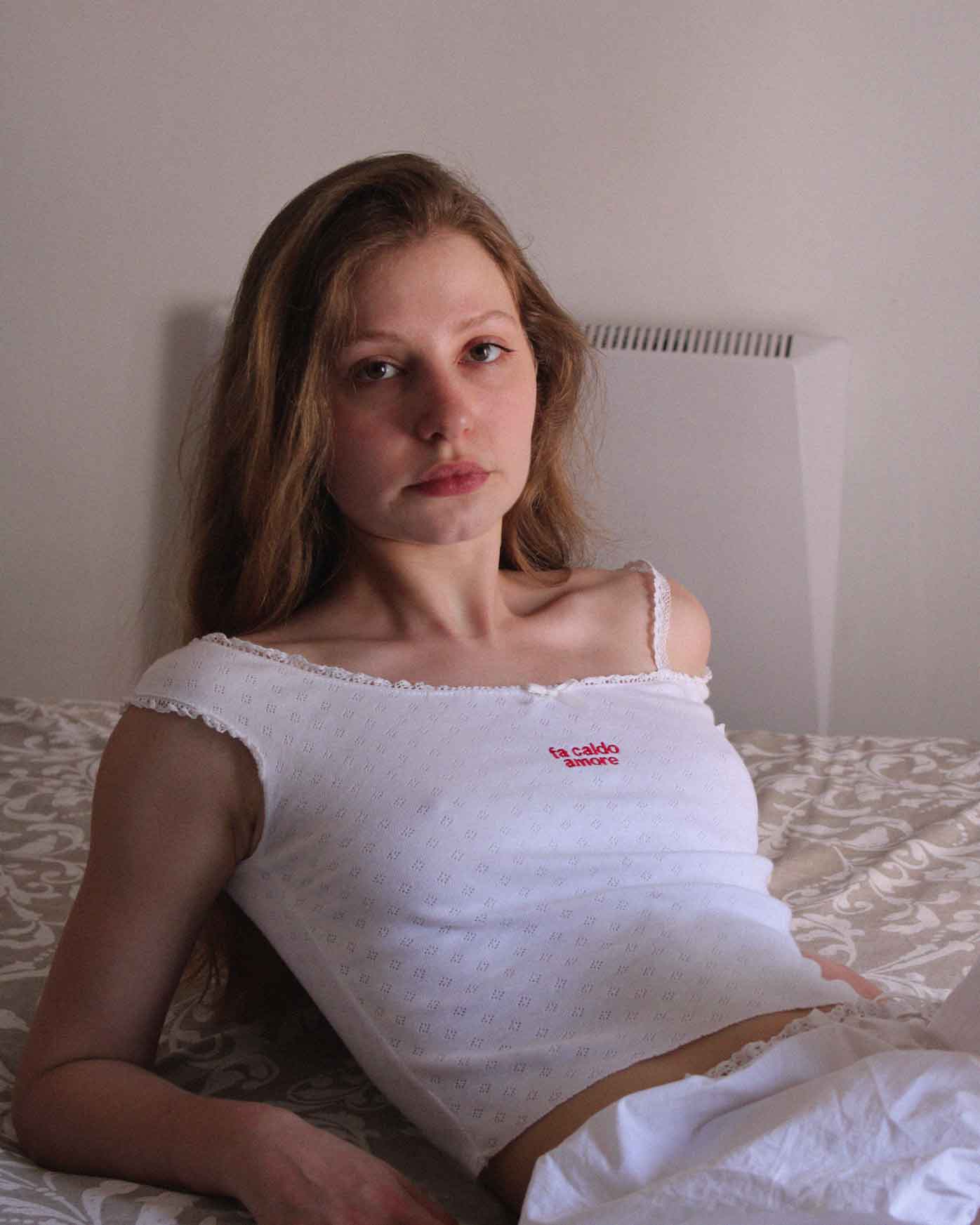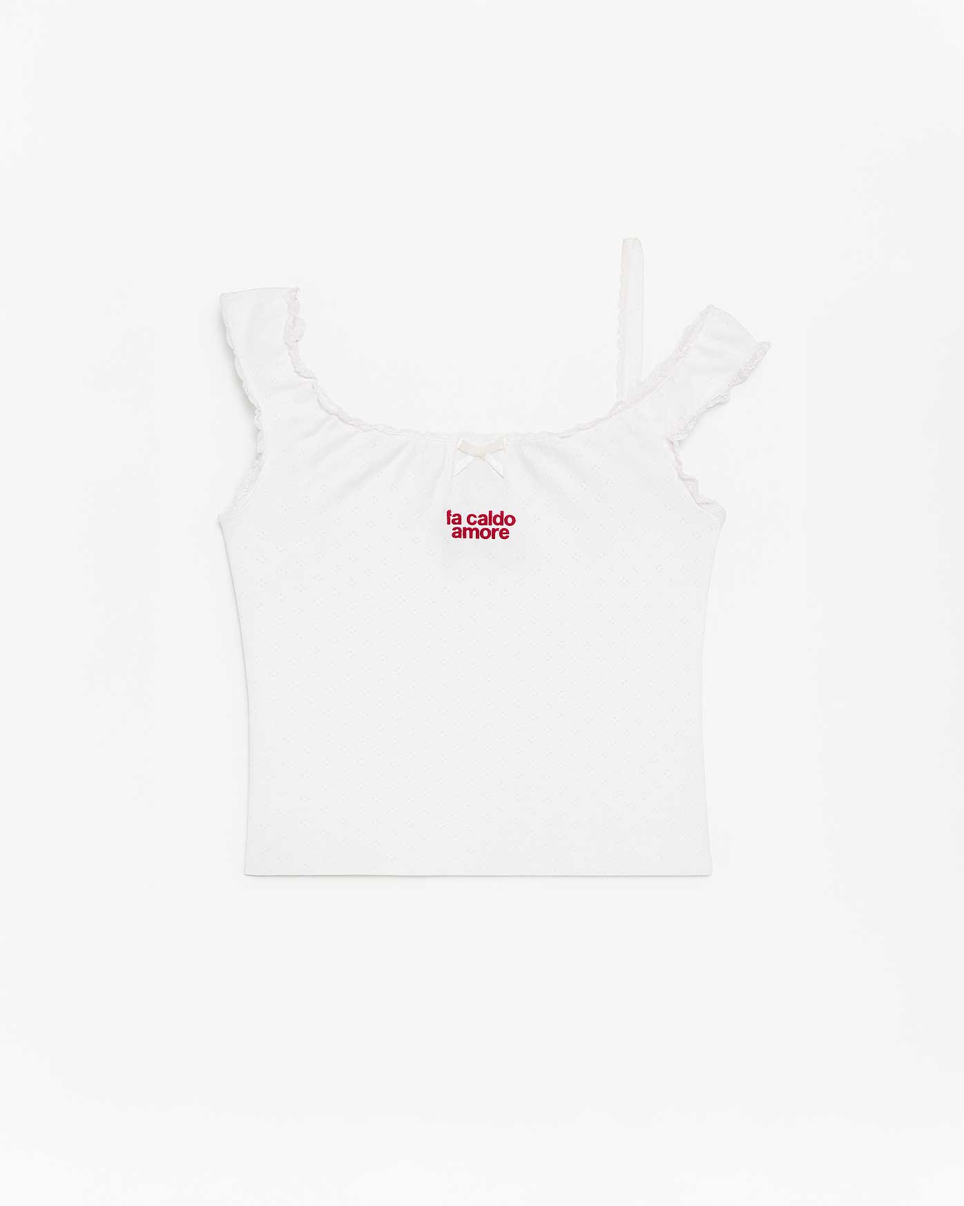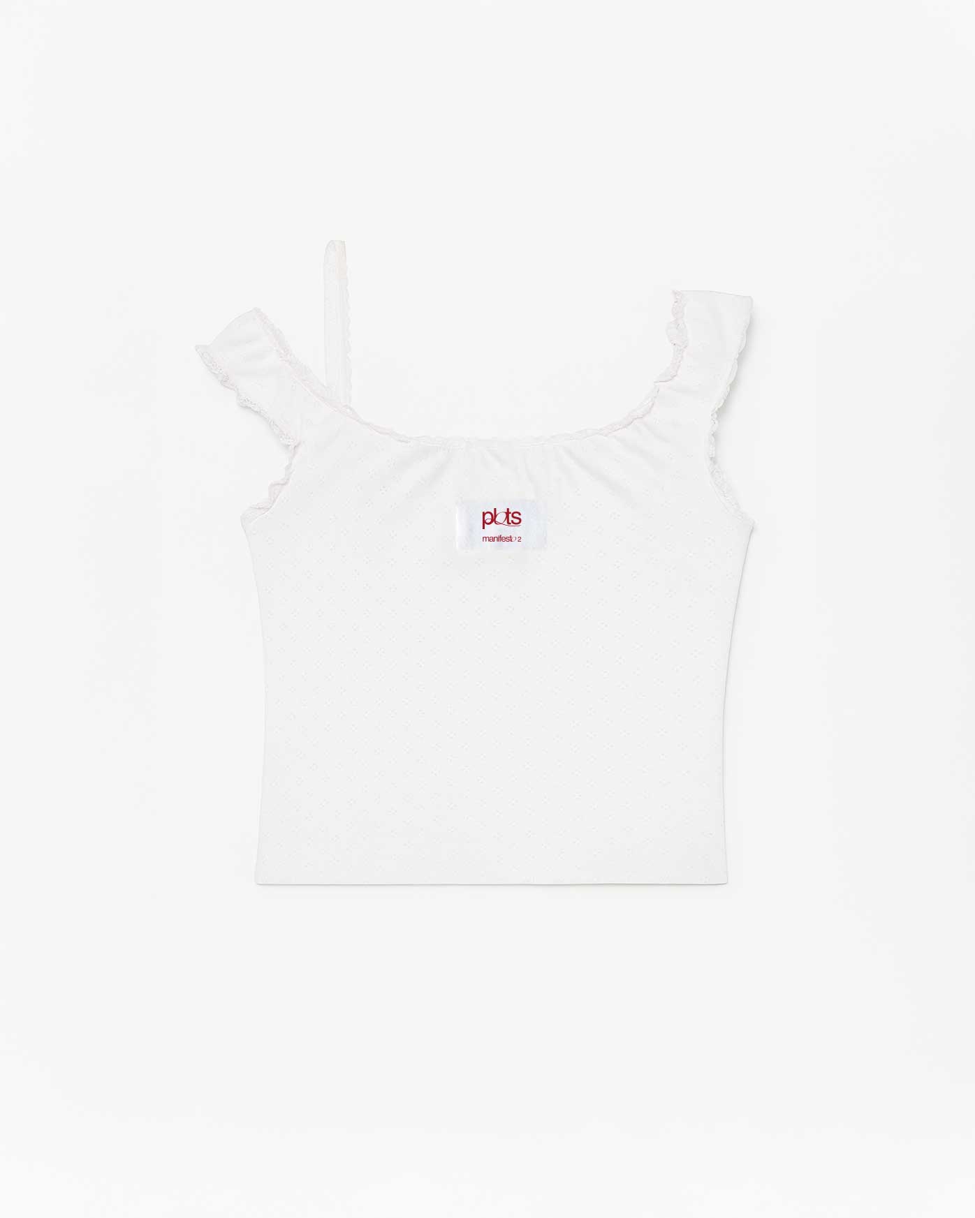 Asymmetric dropped shoulder, vintage lace strap, baby bow trim.