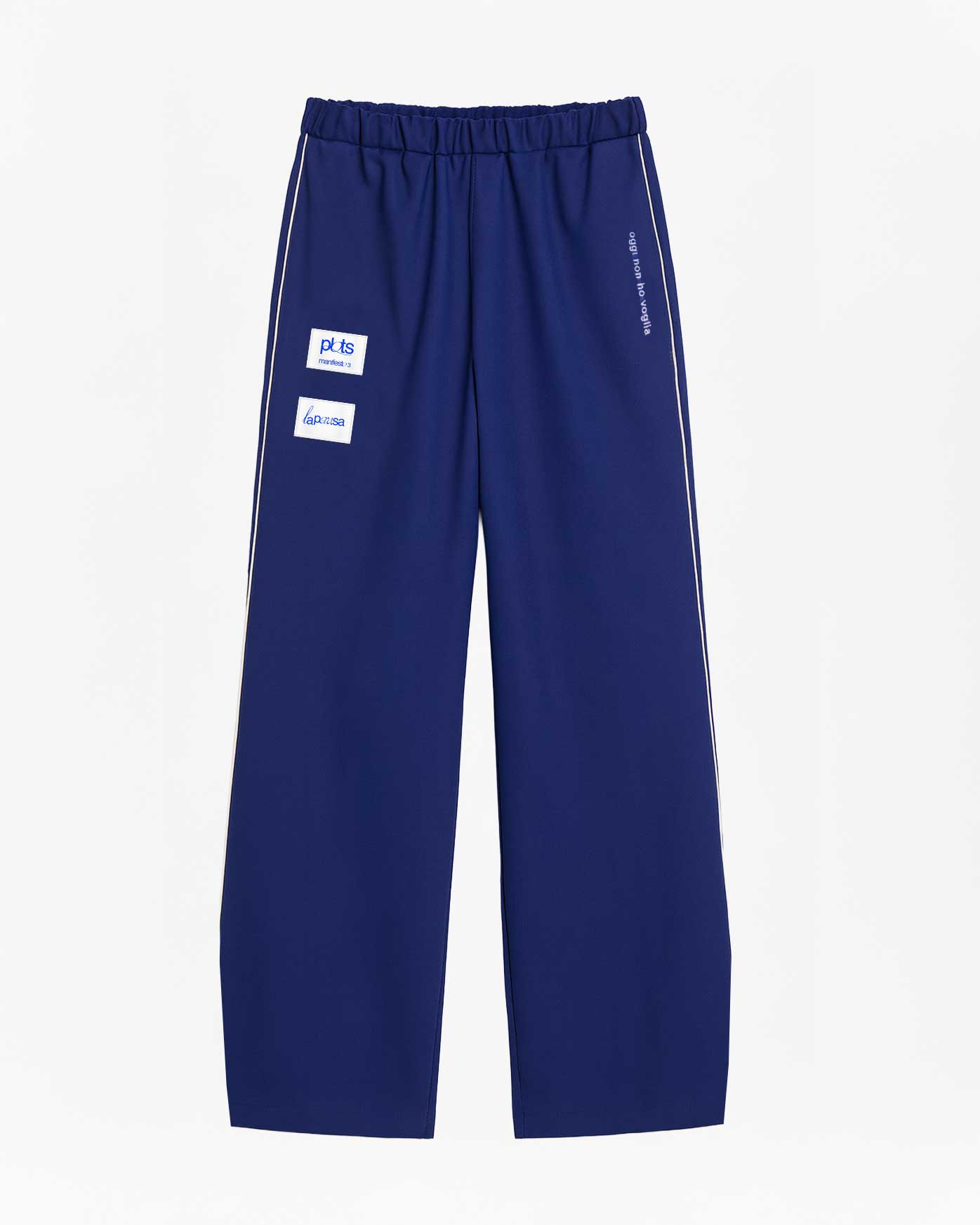 Hand-made jersey jogger with a barrel-leg wide fit. Manifesto 3 labels and embroidered leg.